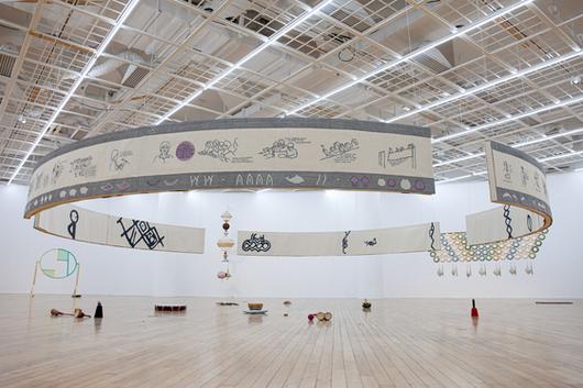 영국 브리스톨을 기반으로 활동하는 홍영인의 첫 국내 미술관 개인전 ‘다섯 극과 모놀로그’(7월 20일까지)가 서울 아트선재센터에서 지난 9일 개막했다. 길이 40m에 달하는 대형 태피스트리 ‘다섯극’을 비롯해 동물 장난감 형상의 조각들과 사운드 설치 작품 ‘우연한 낙원’을 하나의 ‘공연’처럼 선보이는 독특한 전시다.