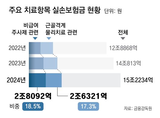 12일 금융감독원은 지난해 실손보험 지급보험금이 15조2000억 원으로 전년(14조1000억 원) 대비 1조1421억 원(8.1%) 늘어났다고 밝혔다. 특히 비급여 주사제(2조8092억 원), 도수치료 등 근골격계 질환 보험금(2조6321억 원)이 전체 보험금의 35.8%를 차지한 것으로 집계됐다. 이는 암 치료(1조5887억 원) 등 타 치료 보험금을 크게 웃도는 숫자다.