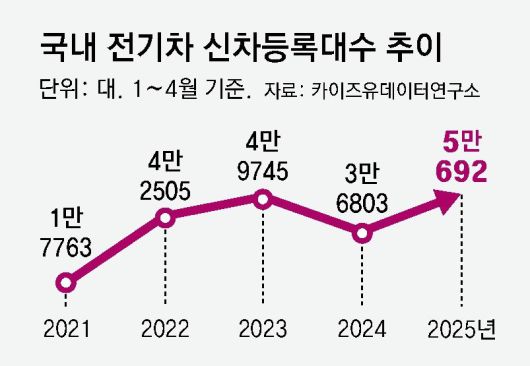 12일 카이즈유데이터연구소에 따르면 올해 1∼4월 국내에 등록된 신차 중 전기차가 총 5만692대인 것으로 집계됐다. 전년 동기(3만6803대)보다 37.7% 늘었다.