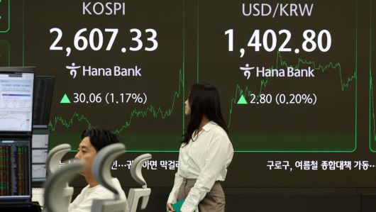 코스피가 전 거래일(2577.27)보다 30.06포인트(1.17%) 상승한 2607.33에 마감한 12일 오후 서울 중구 하나은행 딜링룸 전광판에 지수가 표시되고 있다. 2025.05.12 뉴시스 |