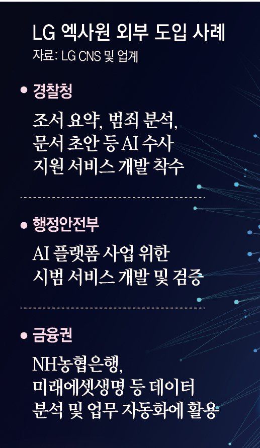 금융권에서도 엑사원 활용 시도가 이뤄지고 있다. LG CNS는 NH농협은행, 미래에셋생명 등 주요 금융 업체로부터 인공지능 전환(AX) 사업을 수주해 엑사원을 활용한 업무 고도화를 추진하고 있다. LG CNS 관계자는 “엑사원은 기업들이 중시하는 보안과 안정성에 강점이 있고, 한글 지원 능력과 데이터 인식 및 처리 능력이 뛰어나다”고 설명했다.