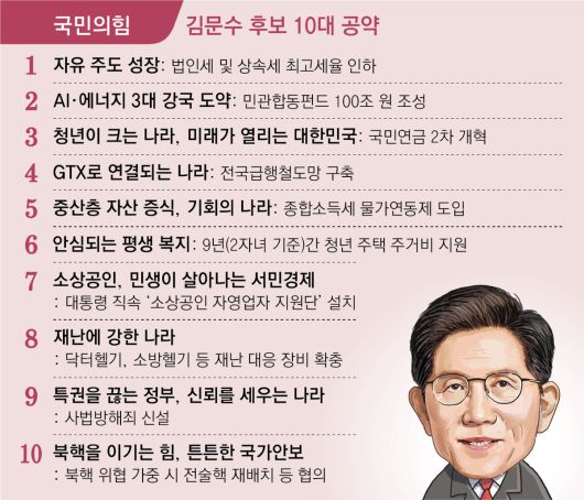 김 후보는 이날 이 같은 내용을 담은 10대 공약을 중앙선거관리위원회에 제출했다고 밝혔다. 김 후보는 1∼7호 공약까지 모두 경제 관련 공약으로 채웠다. 1호 공약인 자유 주도 성장에는 기업 규제 대폭 완화와 세금 감면, 주 52시간제 근로시간 개선 등이 담겼다. 2호 공약인 인공지능(AI)·에너지 3대 강국 도약에는 글로벌 기업 참여 민관합동펀드 100조 원 조성, 과학기술부총리 신설 등이 포함됐다. 이에 앞서 더불어민주당 이재명 후보도 AI 분야에 100조 원 투자 계획을 공약으로 내놓은 바 있다.
