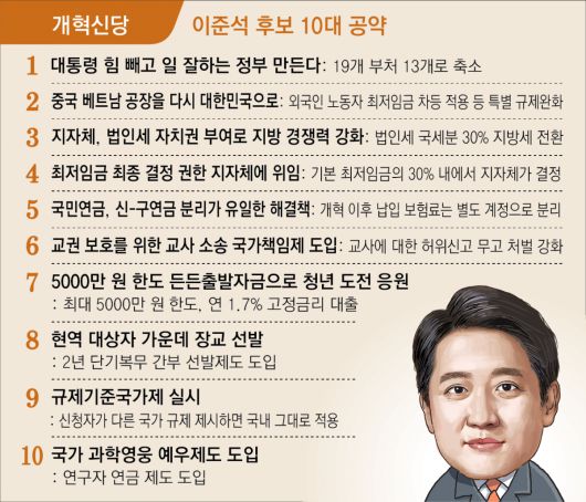 개혁신당 이준석 대선 후보는 12일 1호 공약으로 현재 19개 부처를 13개로 줄이는 ‘작은 정부’ 공약을 내세웠다. 해외 이전 국내 기업의 국내 복귀를 지원하고 법인세 부담을 줄이는 등 친기업 정책도 내놨다. 청년을 위해 5000만 원 한도의 저리 대출을 제공하겠다고도 약속했다.