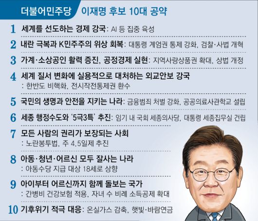 더불어민주당 이재명 대선 후보는 12일 중앙선거관리위원회에 제출한 10대 정책공약에서 1순위 공약으로 인공지능(AI) 등 신산업 집중 육성을 꼽았다. 이어 내란 극복과 민주주의 회복, 가계·소상공인 활력 증진 및 공정경제 실현을 내세웠다. 그는 선진국 수준으로 AI 예산을 증액하고, 아동수당을 현행보다 확대하겠다고 밝히면서도 구체적인 재원 조달 방식은 명시하지 않았다.