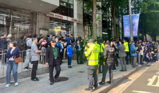 제21대 대통령 선거를 앞두고 12일 서울 중구 광화문 청계광장에는 이재명 대선 후보자의 첫 선거 운동을 보러온 시민들로 가득했다. 곳곳에 경찰관이 배치돼 만일의 상황에 대비했다. /사진=민수정 기자. |
