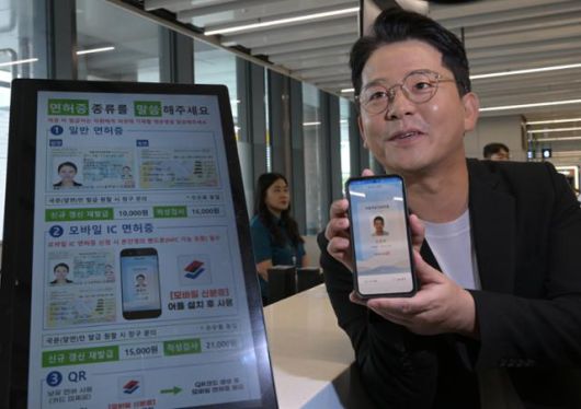 개그맨 김준호가 디지털 신분증 도입 1주년을 맞아 2023년 8월 서울 김포공항 국내선 출국장에서 열린 '찾아가는 모바일 신분증 발급행사'에 참여해 스마트폰에 저장된 디지털 운전면허증을 들어보이고 있다. 서재훈 기자 |