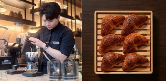 ‘The 22 남대문 베이커리’의 이정인 헤드 바리스타가 필터 커피를 내리고 있다. 오른쪽 사진은 시그니처 메뉴 남산 크루아상. 백종현 기자, 코트야드 메리어트 서울 남대문 |