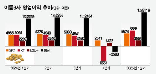SK텔레콤, KT, LG유플러스 국내 이동통신 3사의 올해 1분기 합산 영업이익이 1조5000억원을 돌파했다. 통신 및 비통신 분야의 고른 성장과 AI(인공지능) 사업 수익화가 본격 반영된 결과다. 다만 2분기는 SK텔레콤의 유심 해킹 사고 수습 비용으로 수천억원의 지출이 예상되면서 실적 감소는 불가피할 전망이다.