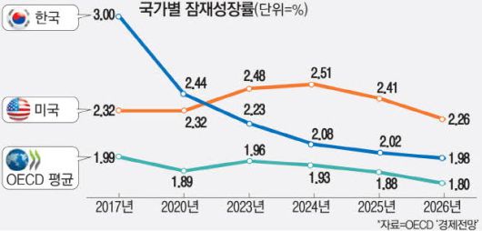 12일 OECD가 업데이트한 ‘경제전망’은 내년 한국의 잠재 국내총생산(GDP) 성장률을 1.98%로 예상했다. 올해 2.02%보다 하향 조정된 수치다. 특히 2% 선이 무너졌다는 점에서 상징성이 크다. OECD가 전망한 한국의 잠재성장률은 2017년 3.0%에서 10년 만에 1%포인트 이상 급락한 것이다. 37개 OECD 회원국 중에서는 낙폭이 7번째로 컸다.