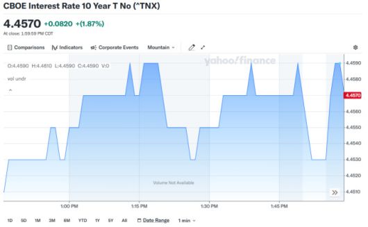 미 국채 10년물 금리 차트, 자료=야후 파이낸스, 2025.05.13 koinwon@newspim.com |