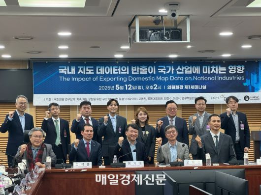 12일 국회 의원회관에서 열린 ‘국내 지도 데이터의 반출이 국가 산업에 미치는 영향’ 토론회 참석자들이 기념 촬영을 하고 있다. [사진 = 정호준 기자]