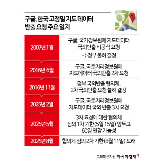 구글이 한국에 고정밀 지도 반출을 요청한 건 올해로 세 번째다. 구글은 2007년 국정원에 처음으로 반출을 요구했지만 거절당했다. 이후 2016년 국토지리정보원에 다시 반출을 요청했으나 그때도 우리 정부는 불허 결정을 내렸다. 안보를 위협한다는 게 주요 이유였다. 하지만 올해에는 기류가 변화가 감지된다. 트럼프 정부가 나서 지도 반출 문제를 '비관세 장벽'으로 규정하고 압박했기 때문이다. 정부는 늦어도 오는 8월까지 반출 여부를 결정하겠다는 입장이다.
