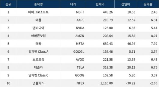애플은 전일 대비 6.31% 상승한 210.79 달러에 거래를 마쳤다. 아마존닷컴은 8.07% 상승하며 208.64 달러를 기록했다. 메타는 7.92% 상승하여 639.43 달러에 거래를 마감했다. 이들 종목들은 최근의 강력한 상승세를 이어가고 있다.