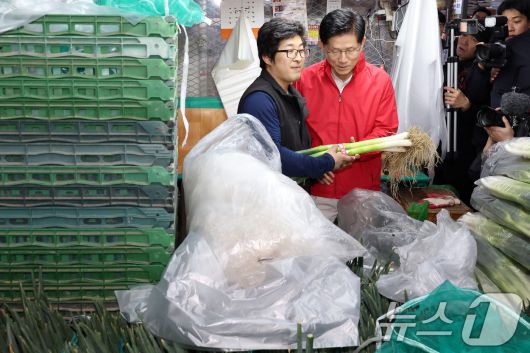 김문수 국민의힘 대선 후보가 제21대 대통령 선거 공식 선거운동이 시작된 12일 새벽 서울 송파구 양재대로 가락시장을 방문해 대파를 구매하고 있다. 2025.5.12/뉴스1 ⓒ News1 이동해 기자 |