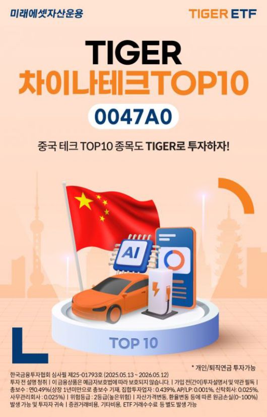 미래에셋자산운용은 한국거래소에 'TIGER 차이나테크TOP10 ETF'를 신규 상장한다고 13일 밝혔다.