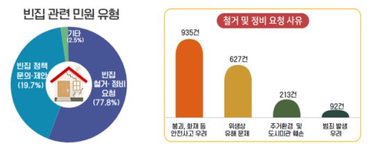 빈집 관련 민원 유형은 ▲철거 및 정비 요청 민원(77.8%)이 가장 많았으며 ▲정책 문의 및 제안(19.7%) ▲기타 불편 사항(2.5%) 순이었다.