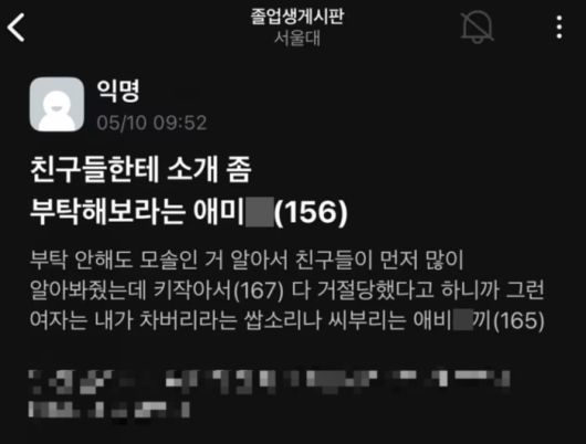 해당 글은 서울대 졸업생으로 추정되는 남성 A 씨가 쓴 글로, 그는 ‘친구들한테 소개 좀 부탁해 보라는 애미X(156㎝)’라는 제목의 글을 썼다.