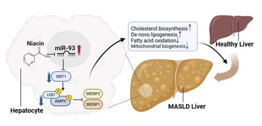 또 FDA 승인 약물 150종을 대상으로 스크리닝을 진행한 결과, miR-93을 가장 효과적으로 억제하는 물질은 비타민B3로 알려진 니아신이었다. 실험에서 니아신을 투여받은 쥐는 간 내 miR-93 수치가 크게 감소했고, SIRT1 유전자의 활성이 눈에 띄게 증가했다. 활성화된 SIRT1은 지방산 분해를 촉진하는 신호전달 경로를 다시 작동시켜 무너졌던 간 내 지질 대사 기능을 정상화하는 데 결정적인 역할을 하는 것으로 확인됐다.