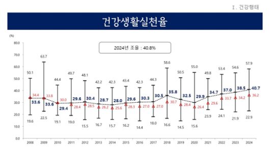경기도의 건강생활실천율은 2014년 28%로 낮아졌다가 2023년 38.5%로 최고치를 기록한 이후 1년 만에 다시 갱신했다. 시군별로는 과천시 57.9%, 성남시 분당구 56.5%, 용인시 수지구 54.7% 순으로 높은 수치를 나타냈다.