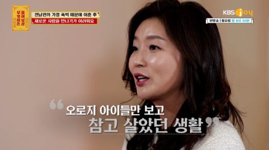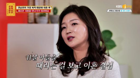 이어 사연자는 "보수적인 집안에서 커서 그런지, 집에는 아버지가 있어야 하고, 잘 살고 싶으면 가정을 잘 지켜야 할 것 같았다"라며 "11살이었던 아들을 때리는 걸 보고 이혼을 결심했다"라고 밝혔다. 전남편이 술을 먹고 들어왔는데, 아들에게 말을 걸었다가 '술 먹고 이야기하는 거 싫다'라고 거절당하자, 옆에 있던 프라이팬을 던지고 아들 위에 올라타서 폭력을 행사했다"라고 설명했다.