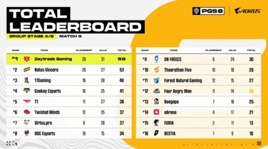 T1은 이날 6개 매치에서 치킨 1회 및 순위 포인트 11점, 킬 포인트 27점을 획득하며 누적 토털 포인트 38점을 획득했다. 그룹 스테이지 종합 순위는 5위에 오르며 최대 16개 팀까지 주어지는 파이널 스테이지 진출에 다른 팀들보다 한발짝 더 다가섰다.