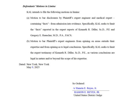 지난 9일(미국 현지시간) 뉴욕주(州) 동부 지방법원은 양측이 제출한 공동사전심리명령(Joint Pretrial Order)에서 “이번 사건은 몬트리올 협약상 ‘사고(accident)’로 간주될 수 있는지 여부가 핵심 쟁점”이라며 배심재판을 열고 약 10일간 심리를 진행할 것이라고 밝혔다. 이번 배심재판은 올해 여름 중 개시될 예정이며, 배상책임 및 금액에 대한 평결은 뉴욕 시민들로 구성된 배심원단이 최종적으로 내리게 된다.