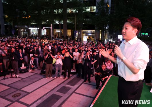 이준석 개혁신당 대선후보가 12일 오후 서울 중구 청계광장에서 열린 집중유세에서 시민들에게 지지를 호소하고 있다. 유희태 기자 |