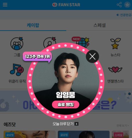 지난 12일 가수 임영웅이 '팬앤스타' 솔로랭킹 1위를 차지했다. /팬앤스타 |