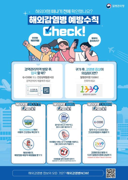 아울러 검역감염병이 유행하거나 유행할 우려가 있어 국내로 유입될 가능성이 있는 검역관리지역(대상감염병 15종, 167개국)을 방문 또는 경유한 경우에는 입국 시 Q-CODE(또는 건강상태질문서)를 제출하고, 귀국 후 감염병 잠복기 동안 발열과 발진, 기침, 콧물 등의 의심 증상이 나타나면 즉시 의료기관을 방문해 진료를 받을 것을 당부했다.