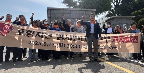 항의하는 포항지진 범시민대책본부(대구=연합뉴스) 황수빈 기자 = 13일 오전 포항 지진 범시민 대책본부가 대구지법 앞에서 항의하고 있다. 2025.5.13 hsb@yna.co.kr