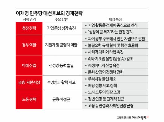 다만 자유주의 경제 정책을 답습하는 것은 아니다. 그는 정부의 역할 등과 관련해서는 공정경제와 적극적인 산업정책의 틀은 유지하고 있다. 대선 공약의 경우 공정경제와 보호자로서 국가 역할은 강화하겠다는 방향을 제시했다. 이 후보는 '대주주의 지배권 남용' 등을 막기 위한 상법상 주주충실 의무 도입과 자본·손익거래 등을 악용한 지배주주의 사익편취 행위 근절을 약속했다. 반면 AI나 재생에너지 등 미래 역점 산업에 있어서는 국가의 과감한 투자를 통해, 미래 성장 먹거리를 차지하겠다는 의지도 강하다. 그는 "정부가 어떤 방향으로 산업경제를 이끌어 갈 거냐에 대한 명확한 방향을 가지고 세부적 기획, 장기적 기획들을 해나가야 하지 않겠냐"고 언급했다. 사안별 접근법에서 점진적 타협을 강조하는 점도 눈에 띈다. 그는 사회적 타협 등이 요구되는 사안을 언급할 때마다 "조금씩" "점진적으로"라는 말을 다수 사용해 왔다.