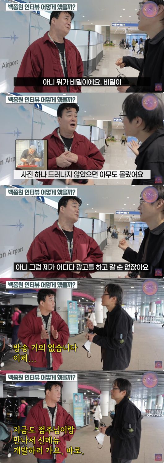 백종원은 "방송을 좀 줄이고 사업에 몰입하면 어떻겠냐"는 질문에 다시 한번 "방송 거의 없다"고 강조하며 "저 당분간은 사업에 올인하려 한다. 지금도 점주님이랑 만나서 신메뉴 개발하러 간다"고 답했다.