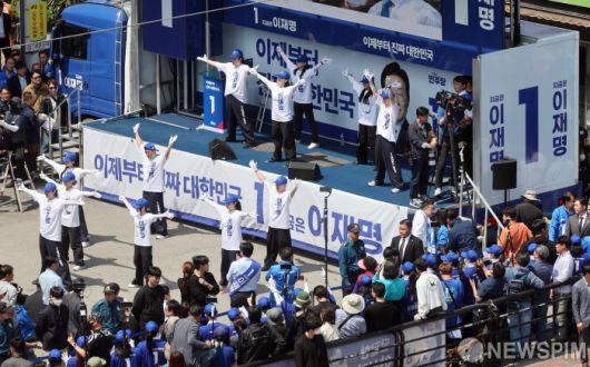 [구미=뉴스핌] 정일구 기자 = 더불어민주당 선겨운동원들이 13일 오전 경북 구미역 앞에서 이재명 후보 지지를 호소하며 율동하고 있다. 2025.05.13 mironj19@newspim.com