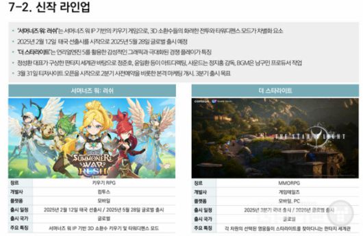 '서머너즈워'는 '귀멸의 칼날' 콜라보를 통해 좋은 실적을 기록했고 야구 게임은 시즌 개막과 함께 트래픽이 상승세를 기록 중이다. '스타시드'는 기대감이 높은 일본시장을 타겟으로 3분기 출시를 예정하고 있다. 4월 18일부터 사전예약을 시작했다. 6월 브랜드 페이지 오픈을 앞두고 스토리 강화 등 일본 시장에 특화된 개발을 진행 중이다.