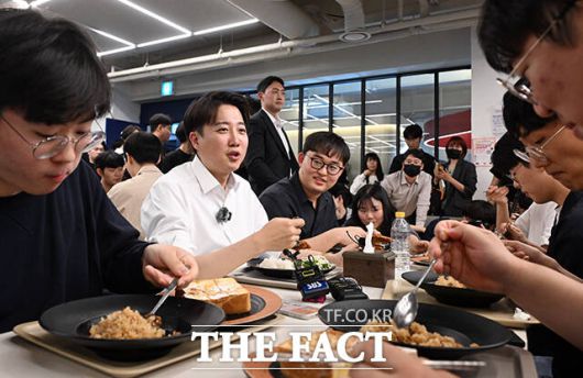 [더팩트ㅣ임영무 기자] 이준석 개혁신당 대선 후보가 13일 오후 대구 북구 경북대학교 학생식당을 찾아 식사중인 학생들과 대화를 나누고 있다.