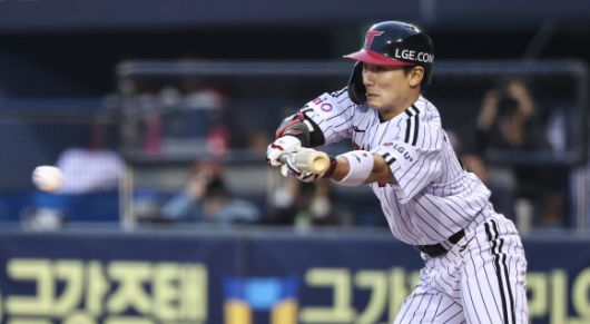 LG 트윈스 신민재가 지난달 15일 서울 잠실야구장에서 열린 2025 KBO리그 정규시즌 삼성 라이온즈와의 홈 경기에서 번트를 시도하고 있다. 뉴스1 |