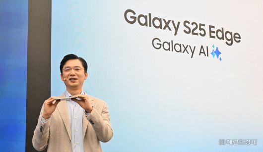 [헤럴드경제=임세준 기자] 임성택 삼성전자 한국총괄 부사장이 13일 서울 삼성 강남에서 갤럭시 S25 엣지를 소개하고 있다. 삼성전자는 이날 온라인으로 갤럭시 신제품 공개 행사 갤럭시언팩 열고, 초슬림 스마트폰 갤럭시 S25 엣지를 공개했다. 삼성전자는 갤럭시 S25 엣지를 통해 갤럭시 S 시리즈 중 가장 얇은 5.8㎜ 두께의 슬림 디자인과 163g 무게를 구현했다.