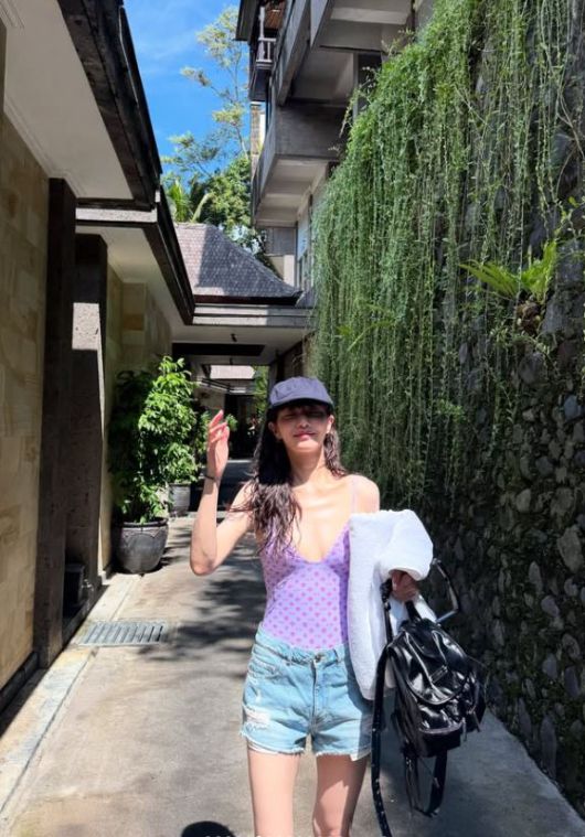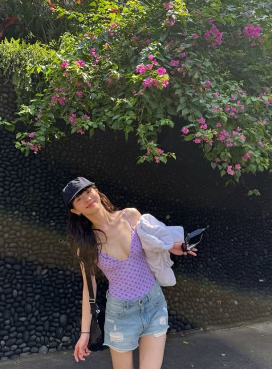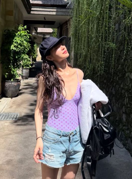 사진 속 그는 가슴 라인이 드러나는 보라색 패턴 수영복 위에 청핫팬츠를 덧입으며 남다른 패션 센스를 뽐냈다. 가녀린 몸매가 부각돼 더욱 눈길을 끈다. 따사로운 햇살을 만끽하며 다양한 포즈도 취했다.