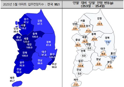 수도권 중 서울은 입주전망지수가 7개월 만에 110을 넘어섰다. 서울은 지난달 87.8에서 이달 11.02로 22.4p 상승했다. 지난 4월 마지막 주 서울 아파트 매매가격이 0.15% 오르며 14주 연속 상승을 이어가고 있는 가운데, 서울을 중심으로 한 시장 회복 기대감이 수도권 전반으로 확대되는 양상이다. 인천은 85.7에서 89.6로 3.9p, 경기는 85.7에서 97.2로 11.5p 각각 상승했다.