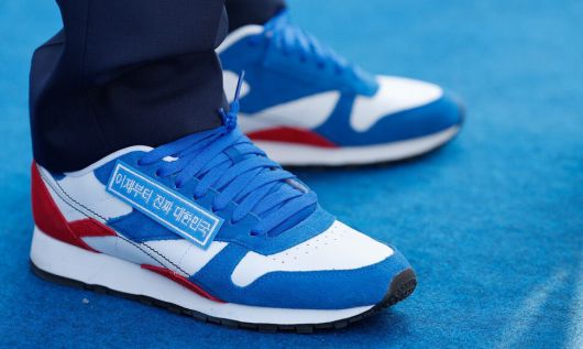 운동화도 눈에 띄었다. 스포츠 브랜드 ‘리복’의 운동화로, 빨간색과 파란색이 어우러졌고 ‘지금은 이재명’이란 문구가 붙어 있었다. 선거 포스터와 현수막에도 어김없이 하단에 빨간색 포인트가 담겼다.