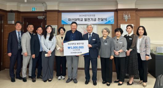 창원시 유니시티에 위치한 365바른치과의원이 13일 마산대학교에 발전기금을 전달했다.