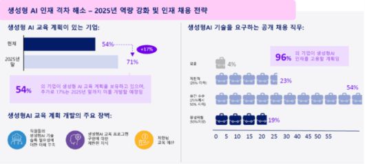 이러한 인재 격차 해소를 위해 기업들은 내부 교육과 외부 채용을 병행하고 있는 것으로 나타났다. 응답 기업의 54%는 생성형 AI 인력 양성을 위한 교육 계획을 이미 수립했으며, 96%는 2025년 안에 관련 인재 채용 계획을 갖고 있다고 답했다.