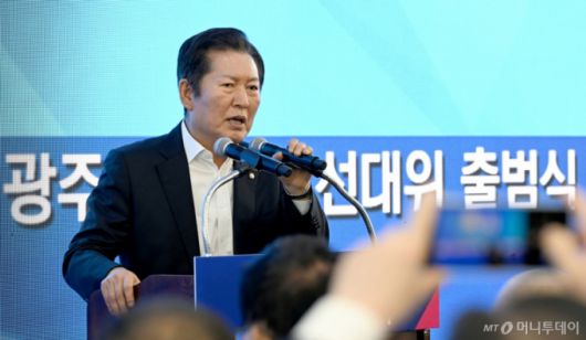 [광주=뉴시스] 김혜인 기자 = 더불어민주당 소속 정청래 국회 법제사법위원장이 8일 오전 광주 서구 서창동 더불어민주당 광주시당 선거연락소에서 열린 선대위 출범식을 통해 발언하고 있다. 2025.05.08. hyein0342@newsis.com /사진= |