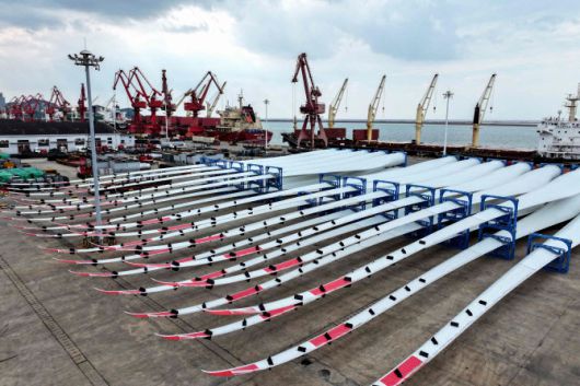 10일(현지시간) 중국 동부 장쑤성 롄윈강 항구에서 풍력 터빈 블레이드가 수출용 선박에 선적되기를 기다리고 있다.(사진=AFP) |