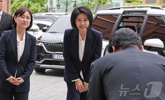 이재명 더불어민주당 대통령 후보의 부인 김혜경 여사가 13일 오후 서울 중구 천주교 서울대교구청에서 정순택 서울대교구장과의 면담을 앞두고 교구청 관계자와 인사를 나누고 있다. ⓒ News1 장수영 기자 |