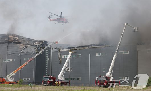 (이천=뉴스1) 최대호 김기현 기자 = 13일 발생한 경기 이천시 부발읍 소재 대형 물류센터 화재의 큰 불길이 잡혔다. 소방대원들은 건물 내부로 진입해 진화 작업과 함께 인명 검색에 나섰다.