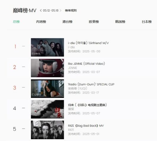 큐브엔터테인먼트(182360) 소속 아이들(미연, 민니, 소연, 우기, 슈화) 미니 8집 'We are'의 수록곡 'Girlfriend' 뮤직비디오가 지난 12일 기준 중국 QQ뮤직 뮤직비디오 종합 차트와 한국 차트에서 동시에 1위를 기록했다. 또한 유튜브 일간 인기 뮤직비디오 한국 1위, 글로벌 9위에도 오르며 활동을 앞둔 아이들의 영향력을 보여줬다.