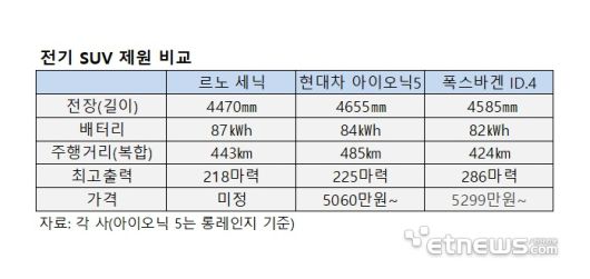 르노 '세닉' 전기차 국내 출시가 임박했다. '2024 유럽 올해의 차'에 선정되며 유럽 현지에서 상품성을 인정받은 만큼 국내에서 현대차 '아이오닉 5', 폭스바겐 'ID.4' 등과 치열한 각축전이 예상된다.
