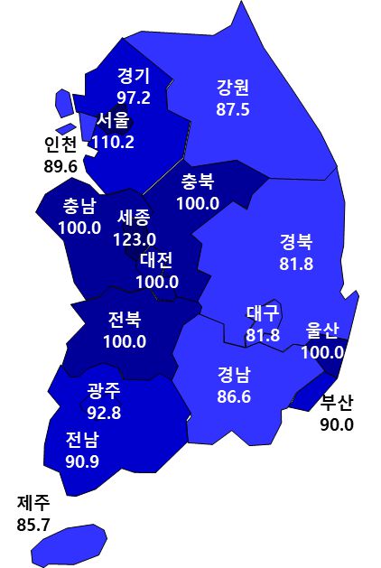 5대 광역시는 대전이 전월과 동일한 100.0으로 보합세를 보였고, 울산은 107.6에서 100.0으로 7.6포인트 하락했으나 광주는 80.0에서 92.8, 대구는 72.2에서 81.8, 부산은 85.0에서 90.0으로 상승했다.