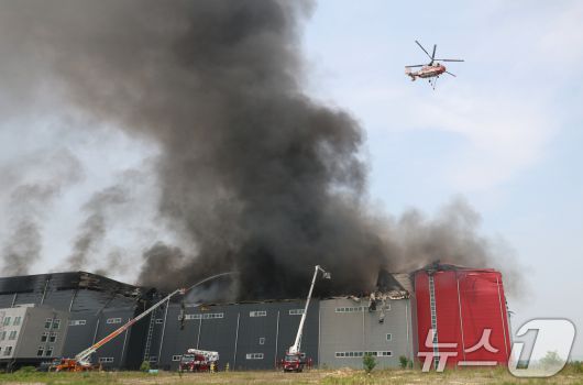 13일 오후 경기 이천시 부발읍 소재 대형 물류창고에서 화재가 발생해 검은 연기가 치솟고 있다. 소방당국은 대응 2단계를 발령해 진화 중이며 인명 피해는 현재까지 없는 것으로 파악됐다. 2025.5.13/뉴스1 ⓒ News1 김영운 기자 |